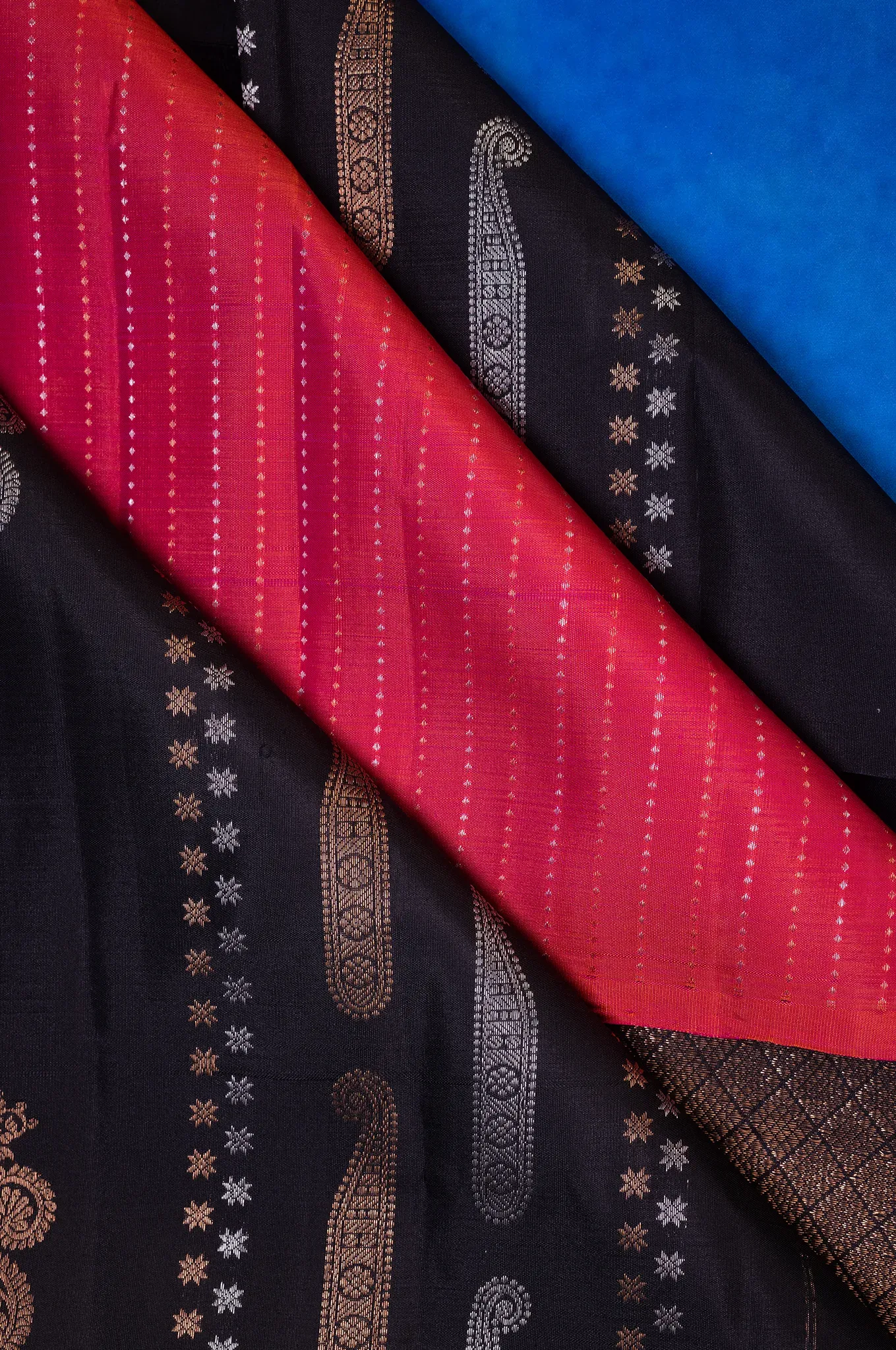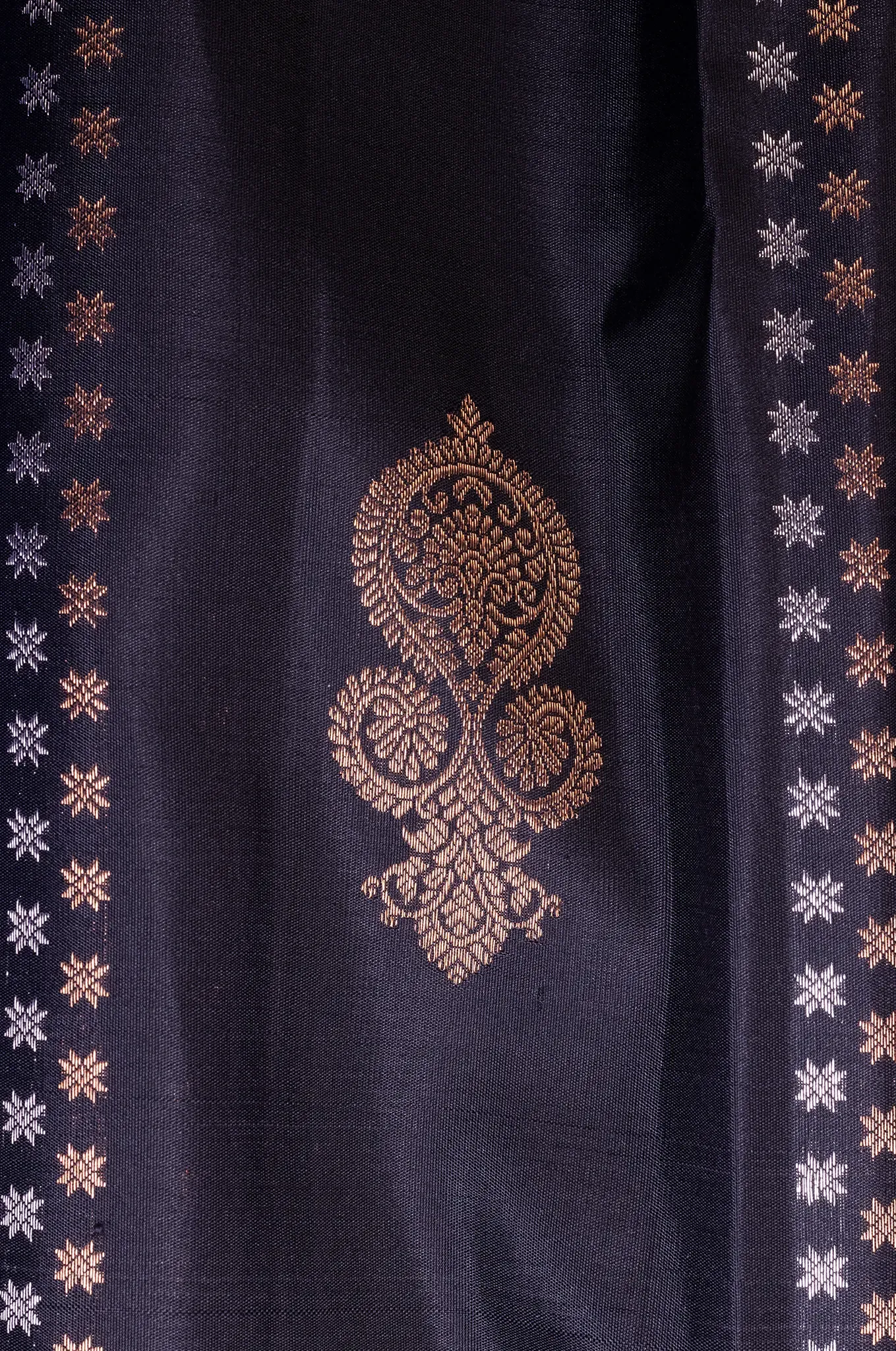 A bold blend of elegance and tradition, this classic black saree is beautifully paired with a striking magenta blouse, creating a rich and captivating contrast. The plain body is elevated with delicate small puttas, adding a subtle shimmer that enhances its timeless appeal