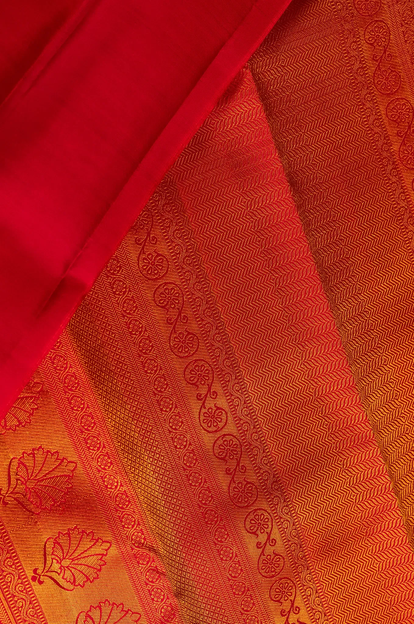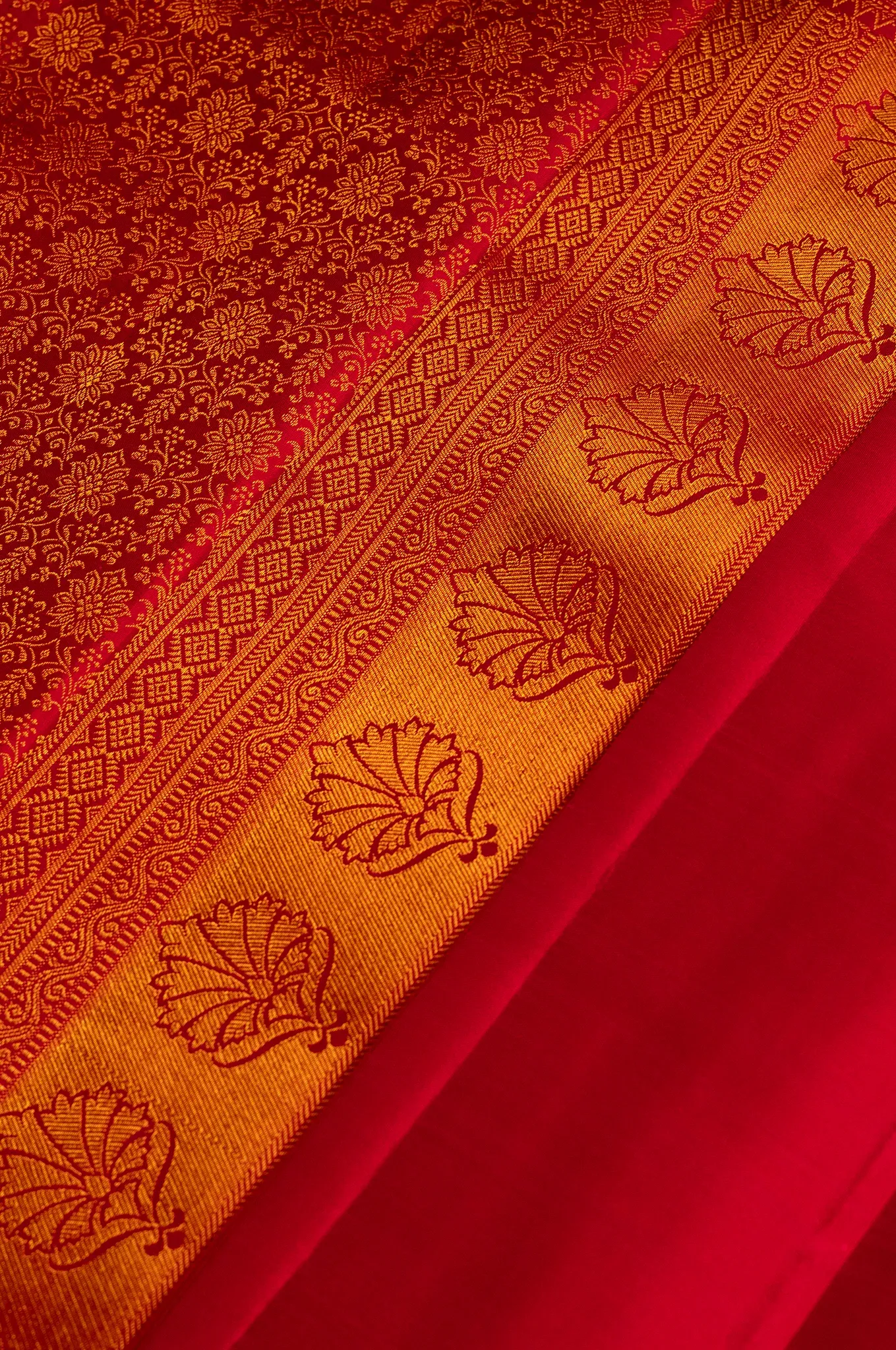 A striking crimson red saree that embodies richness, passion, and timeless elegance. The self border blends seamlessly with the body, adorned with delicate floral designs that add softness and graceful detail to the weave