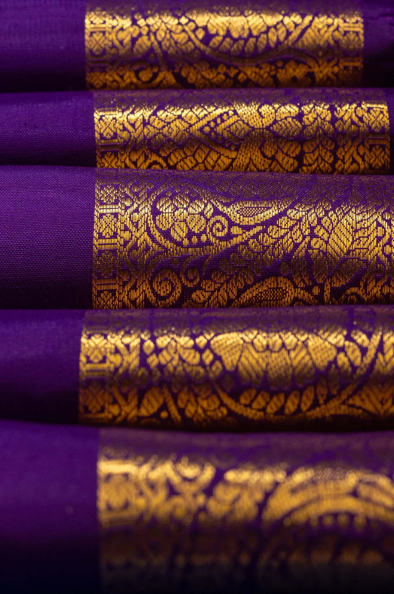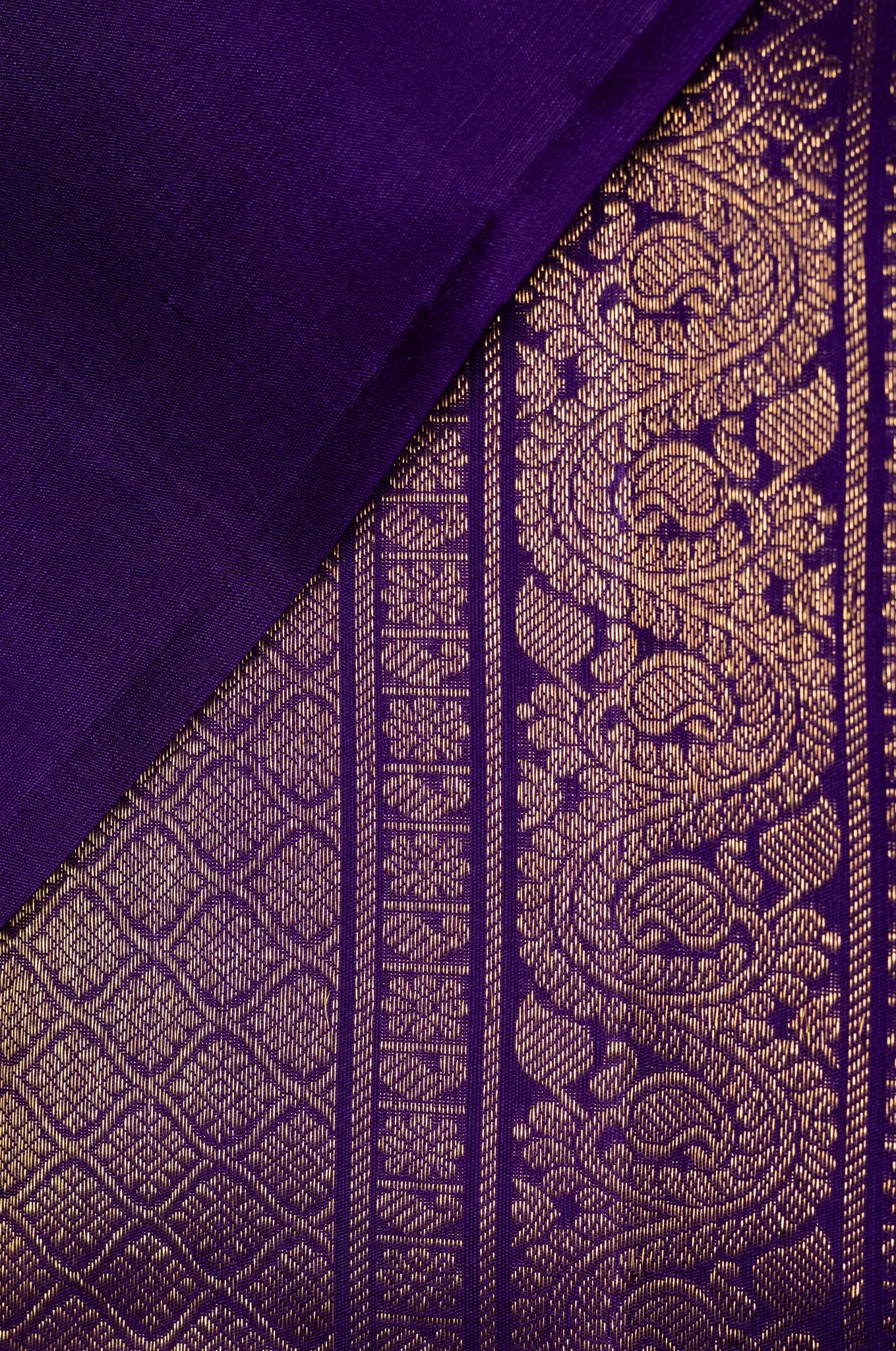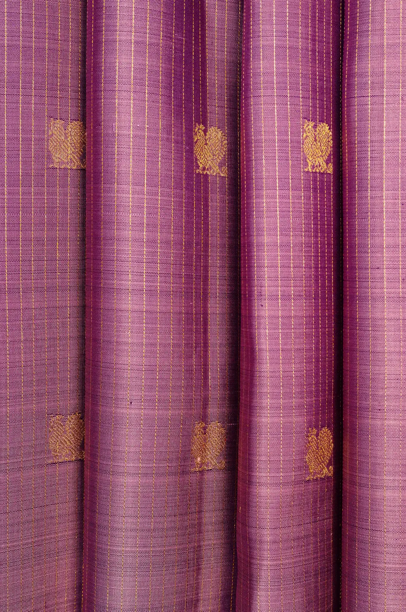 A graceful blend of softness and statement, this lavender silk saree is elevated with a rich dark purple border that adds depth and contrast to its gentle hue. The body features intricate Vairavoosi weaving, adorned with delicate small puttas and enhanced by elegant double putta detailing, creating a refined texture that catches the light beautifully