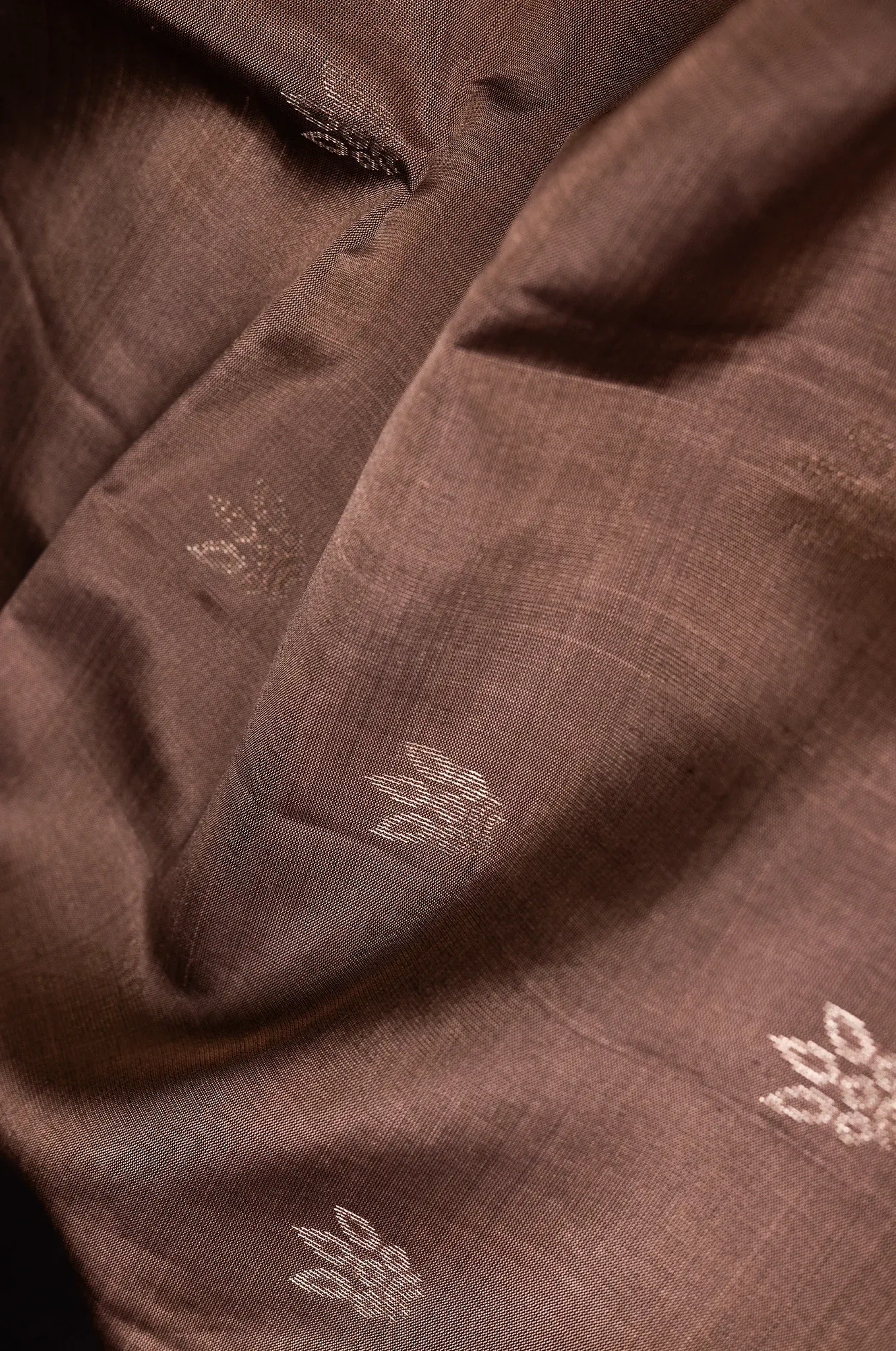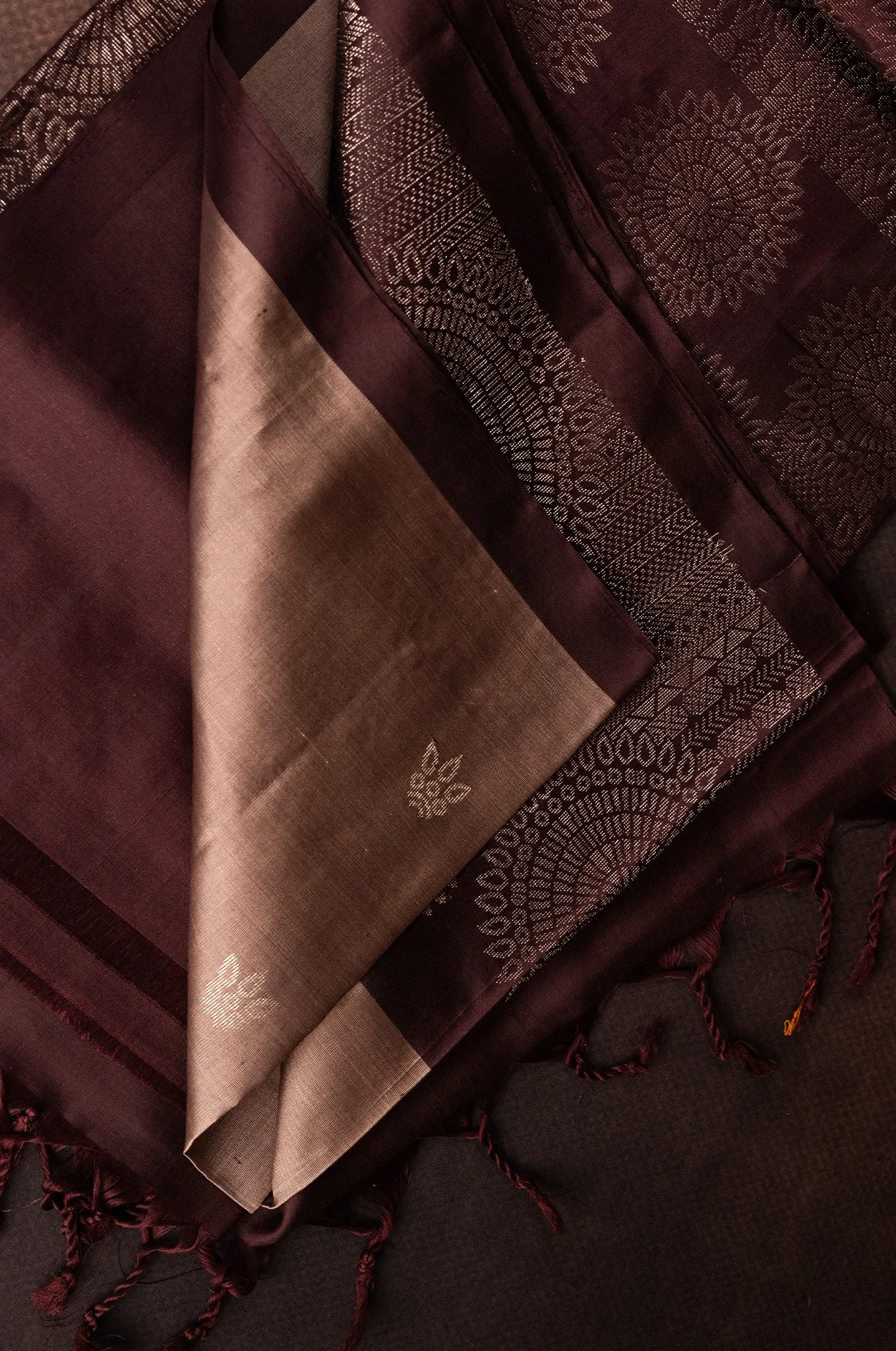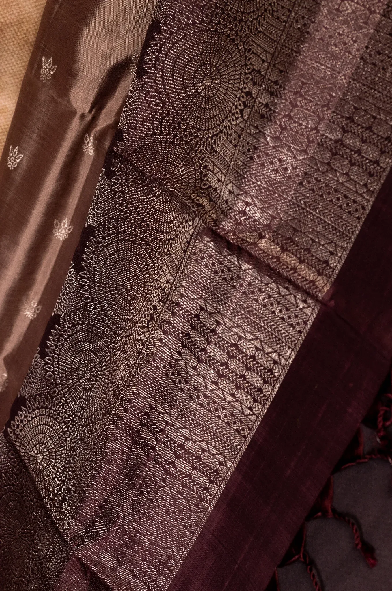 A refined dark cream saree that embodies subtle elegance and timeless charm. The soft, earthy tone is beautifully complemented by a rich dark brown contrast border, creating a warm and sophisticated colour pairing
