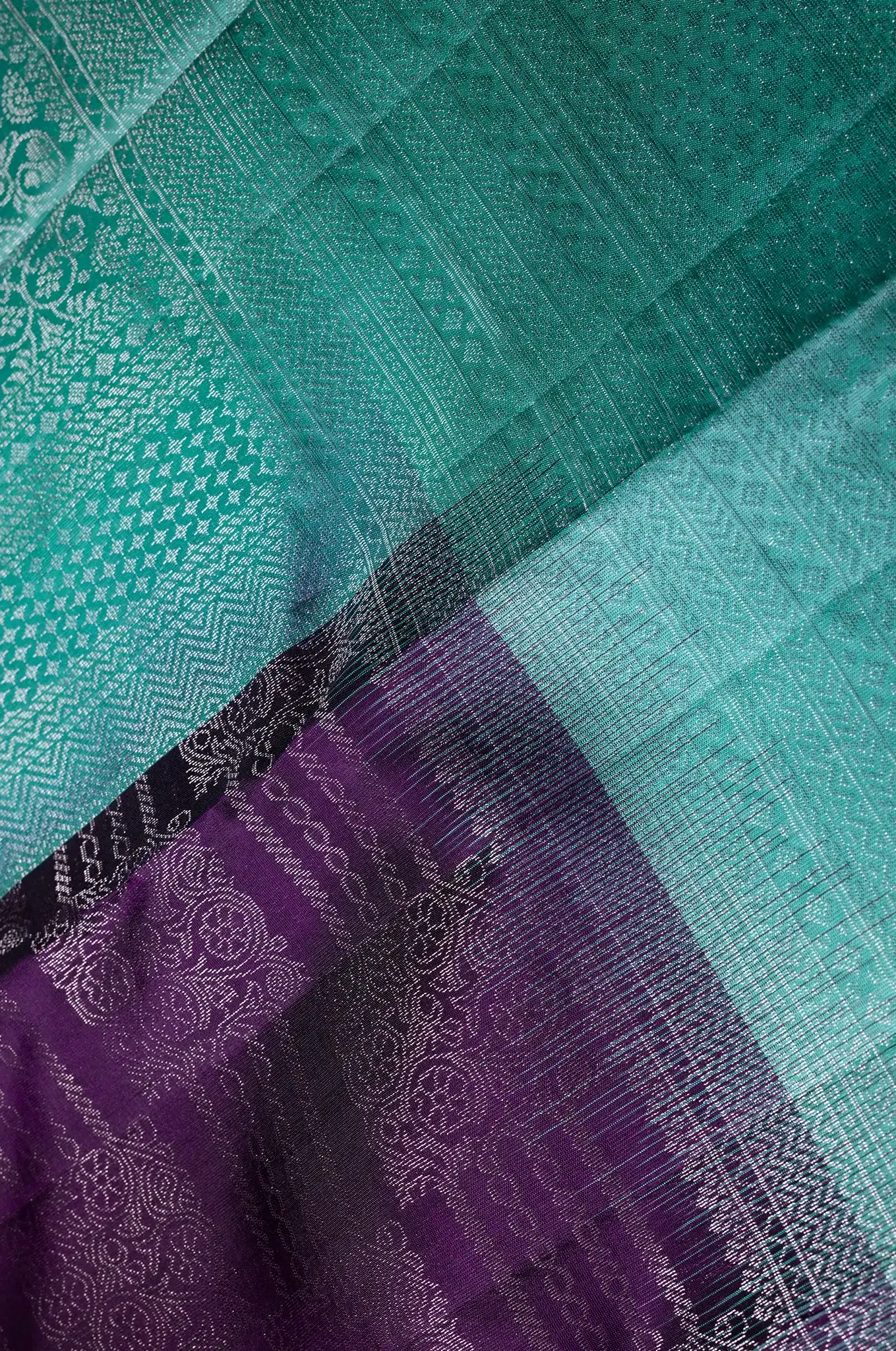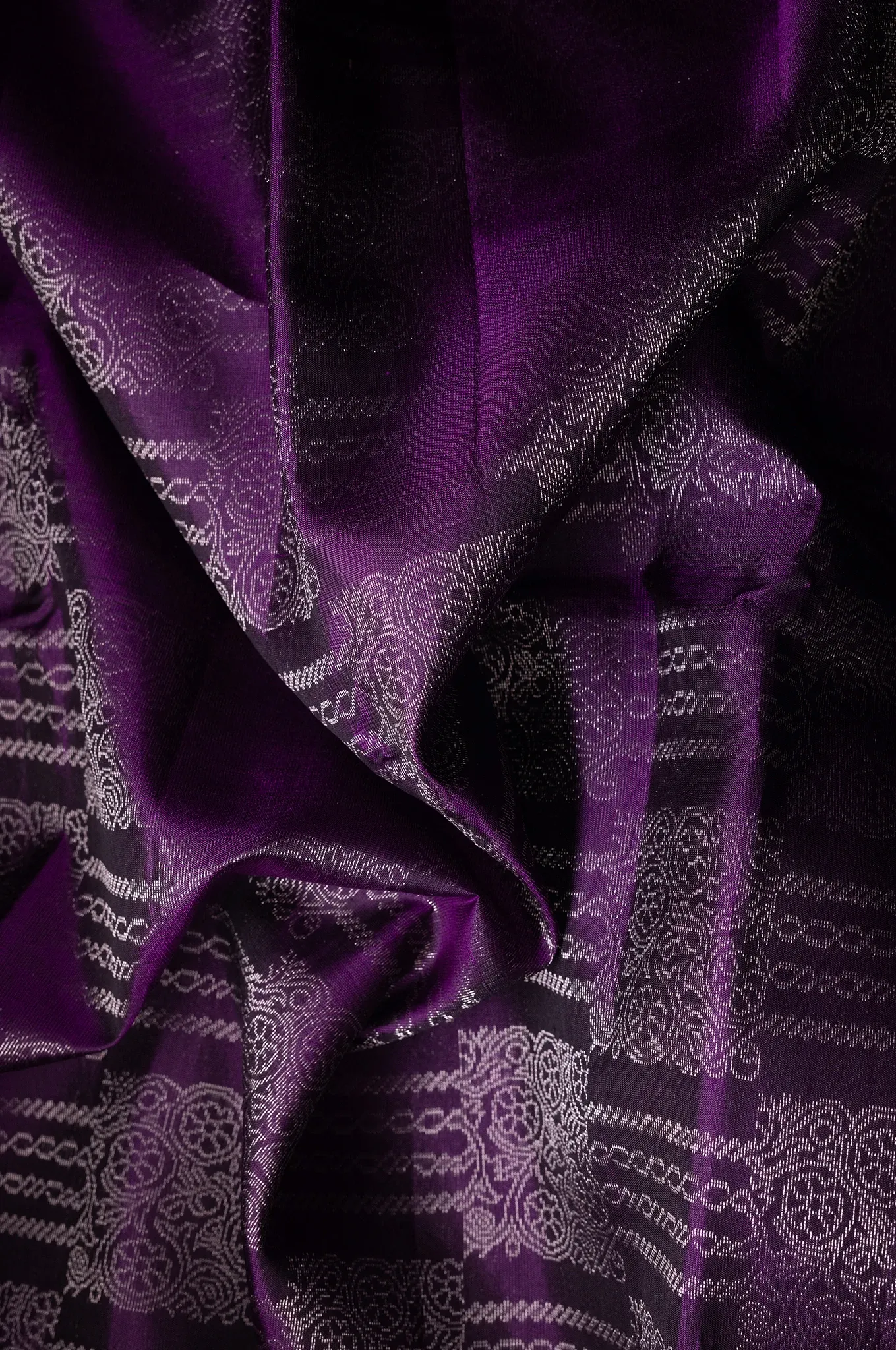A striking dark purple saree that radiates depth and sophistication, beautifully contrasted with a vibrant electric blue border that adds a bold, modern edge. The body features finely woven patterns enriched with motifs running in graceful horizontal lines, creating a structured yet fluid visual appeal