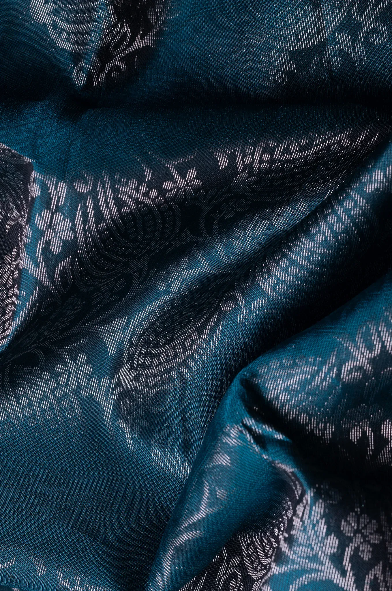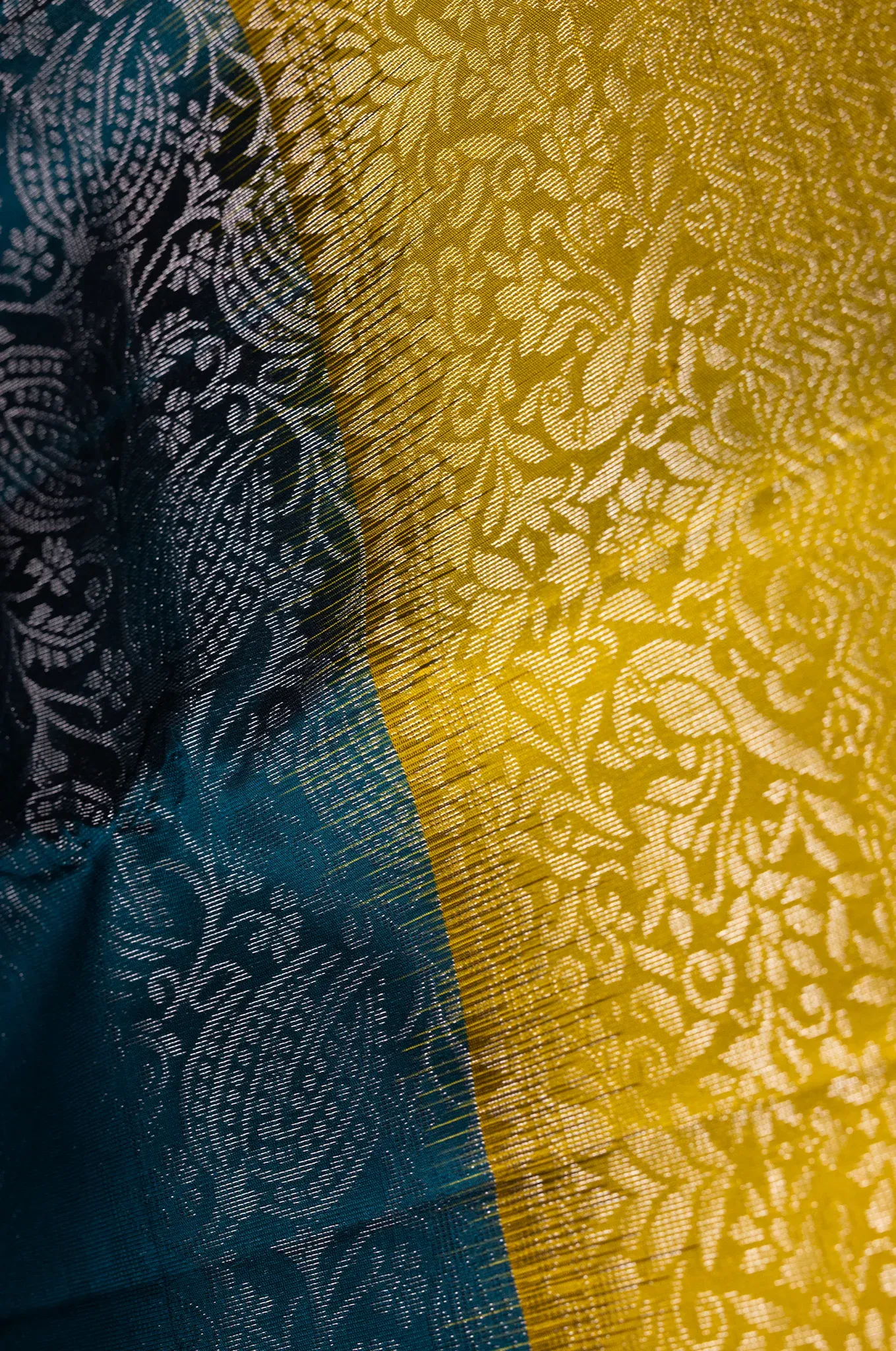 A captivating deep blue saree that reflects elegance and depth, beautifully paired with a bright yellow border that adds a vibrant and festive contrast. The border is adorned with intricate floral patterns that seamlessly blend into graceful peacock motifs, symbolizing beauty, pride, and tradition
