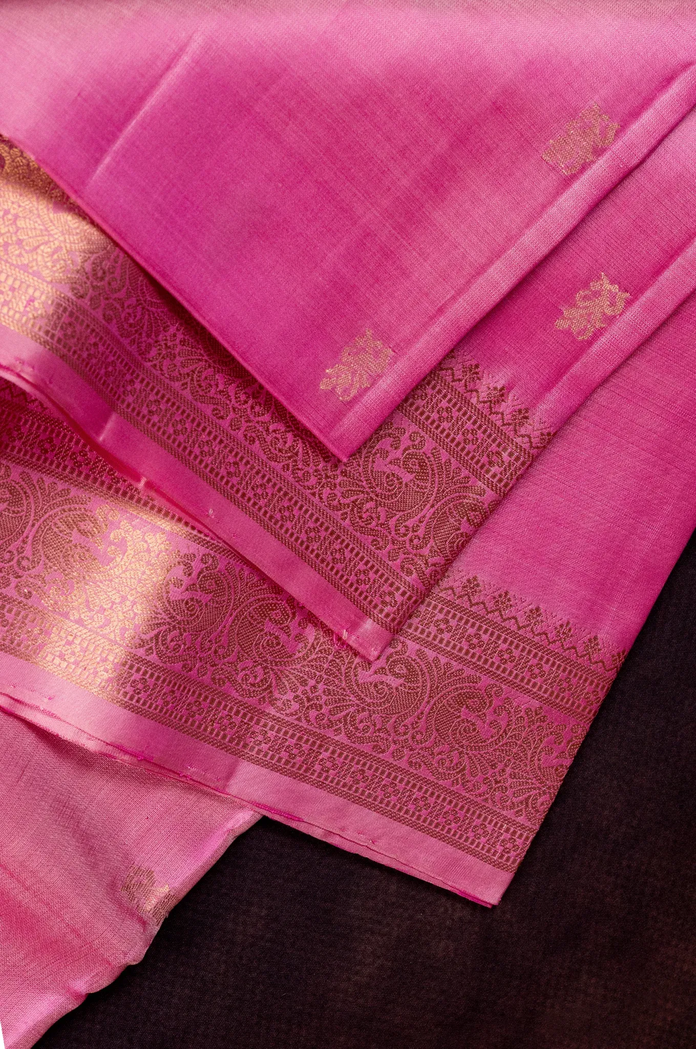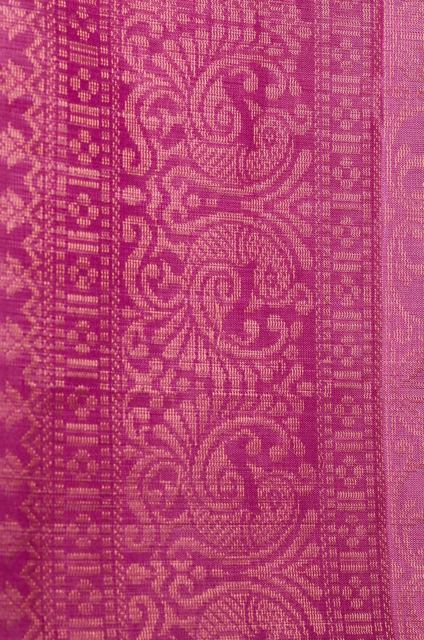 A vibrant hot pink self saree that captures attention with its bold and lively charm. The tone-on-tone weave is enhanced with delicate small flower design putta motifs, adding a soft texture and elegant detail across the body