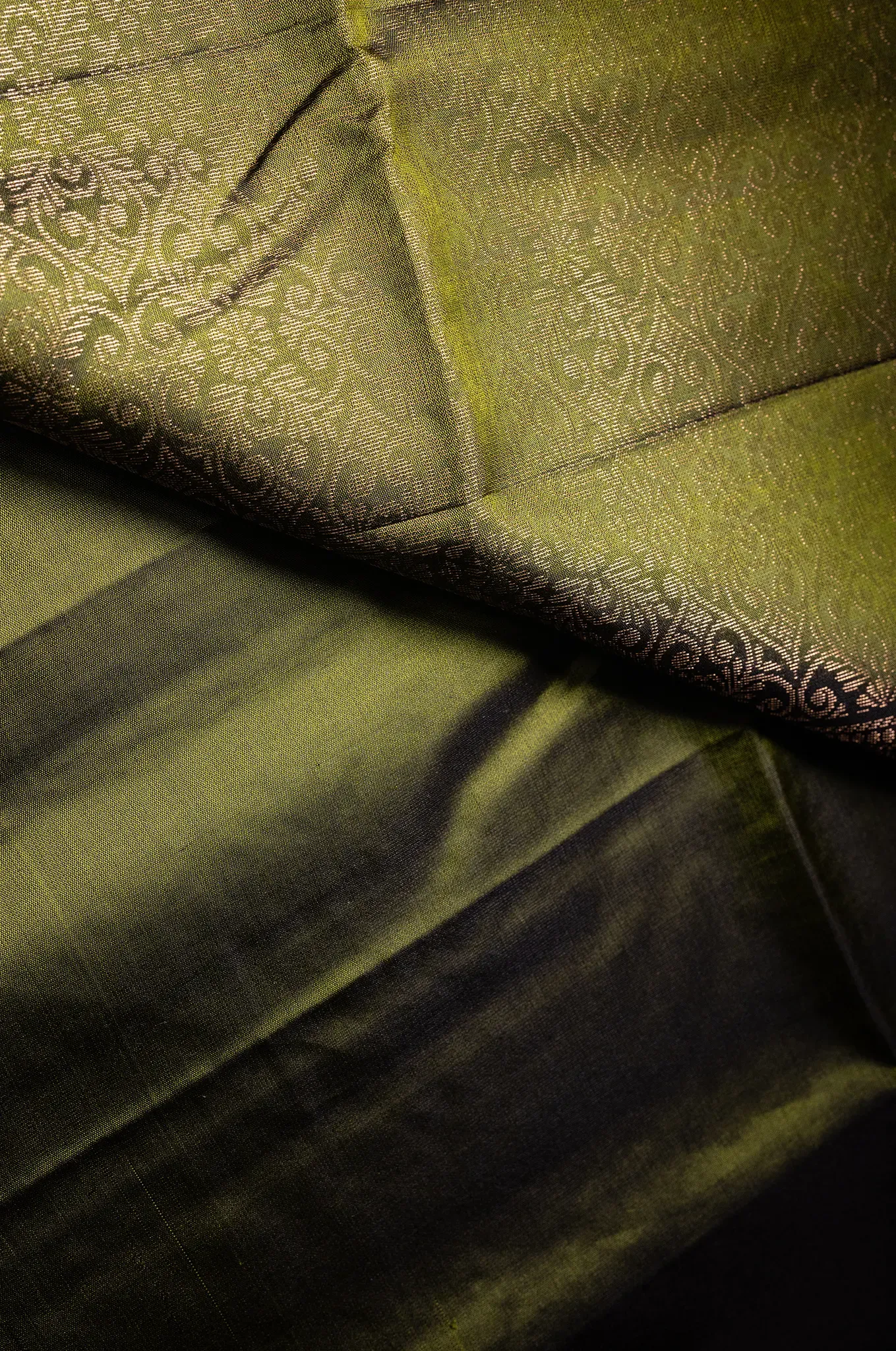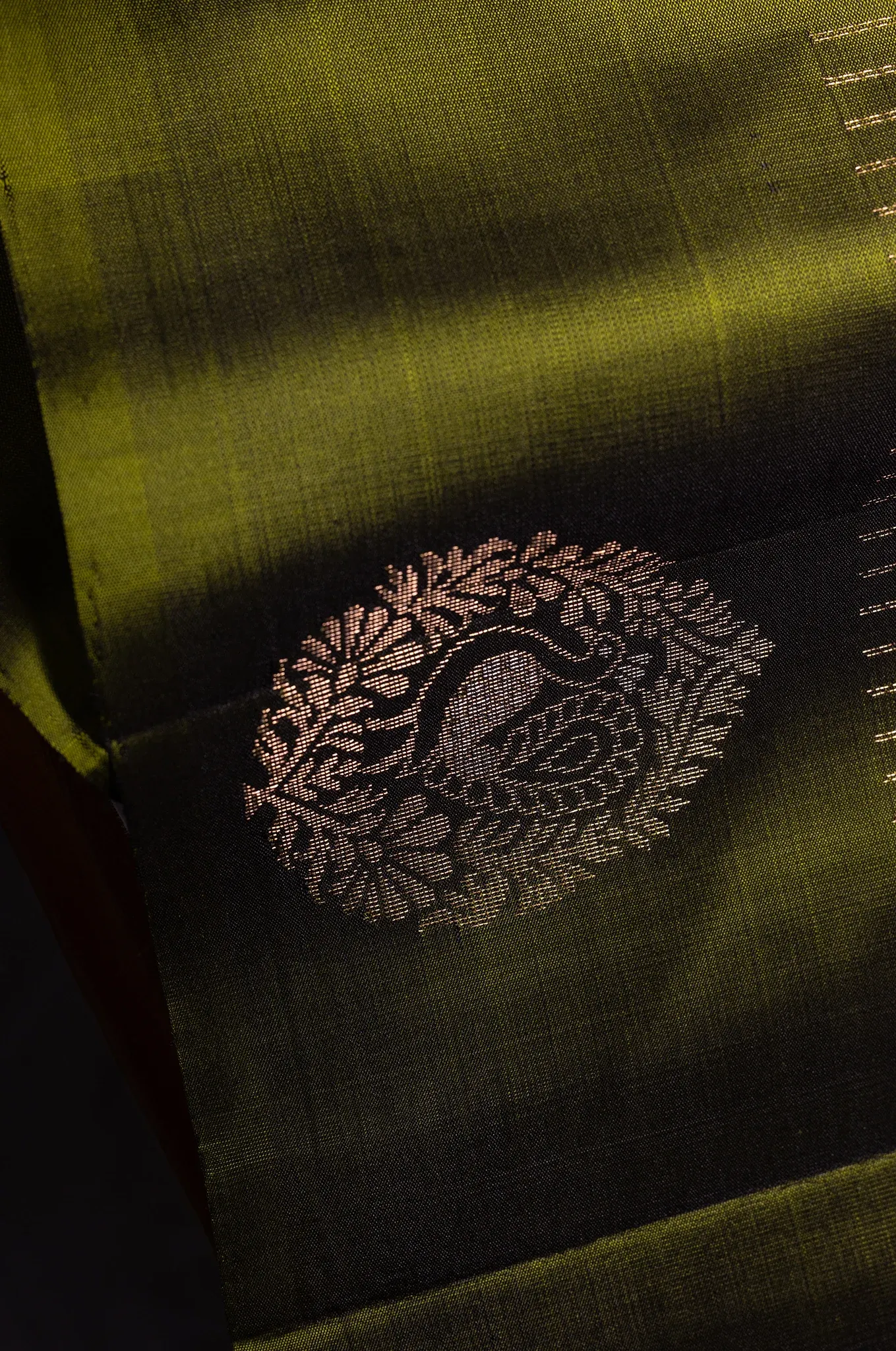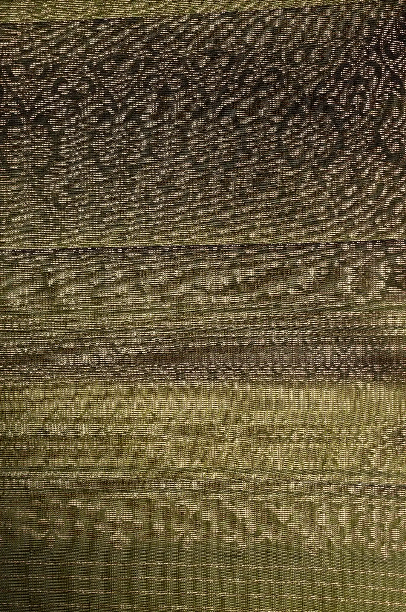 An embodiment of subtle luxury, this olive green self saree features an intricate Viravusi design woven seamlessly into the fabric. The tone-on-tone pattern adds depth and texture, creating a refined look that is both understated and sophisticated