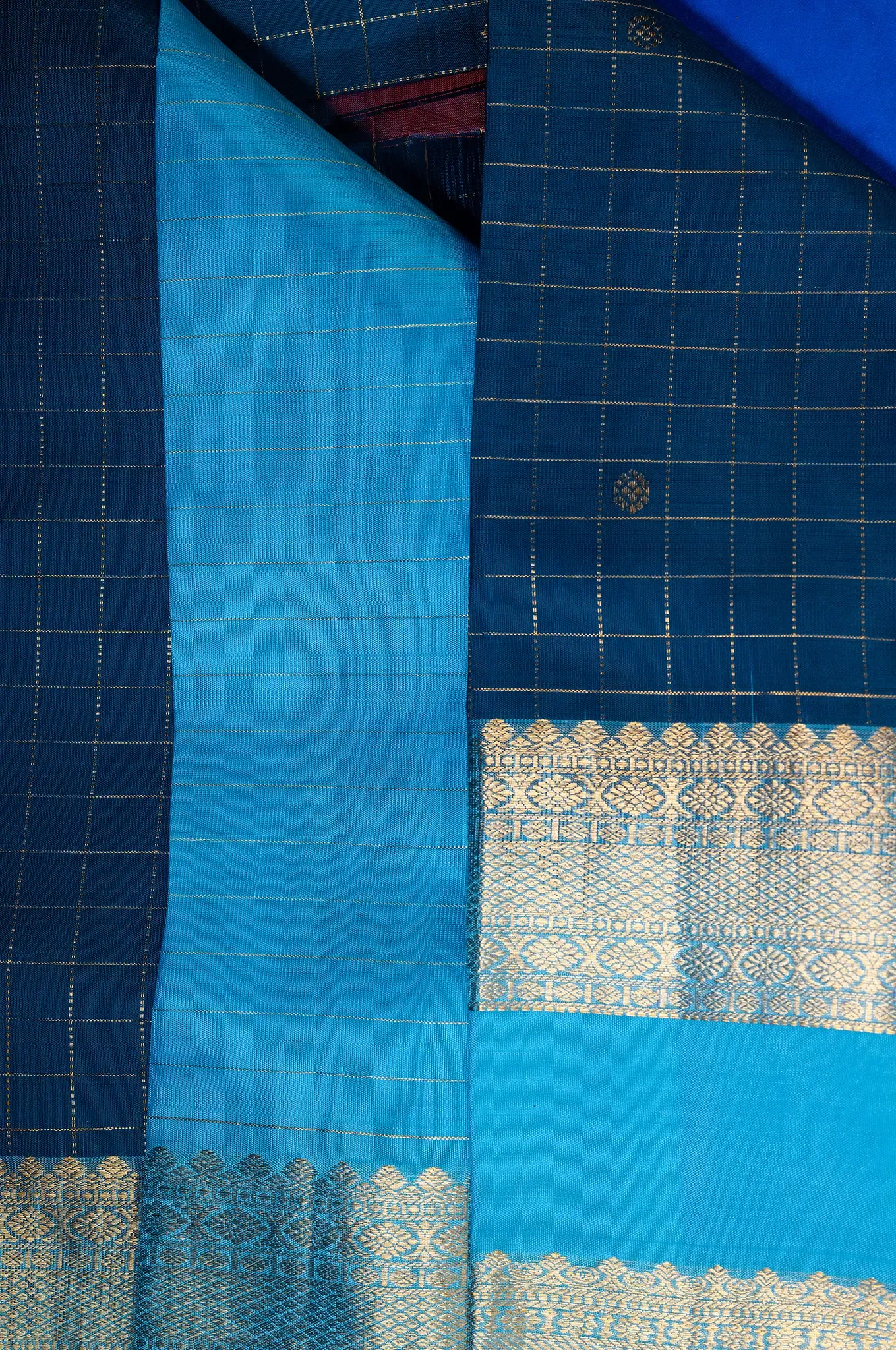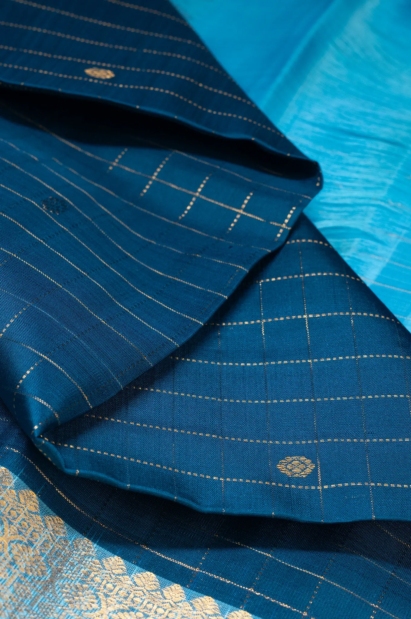 A soothing blend of cool tones and refined detailing, this steel blue silk saree is elegantly paired with a soft sky blue border, creating a graceful and refreshing contrast. The body features a classic checked design, lending structure and timeless appeal to the weave