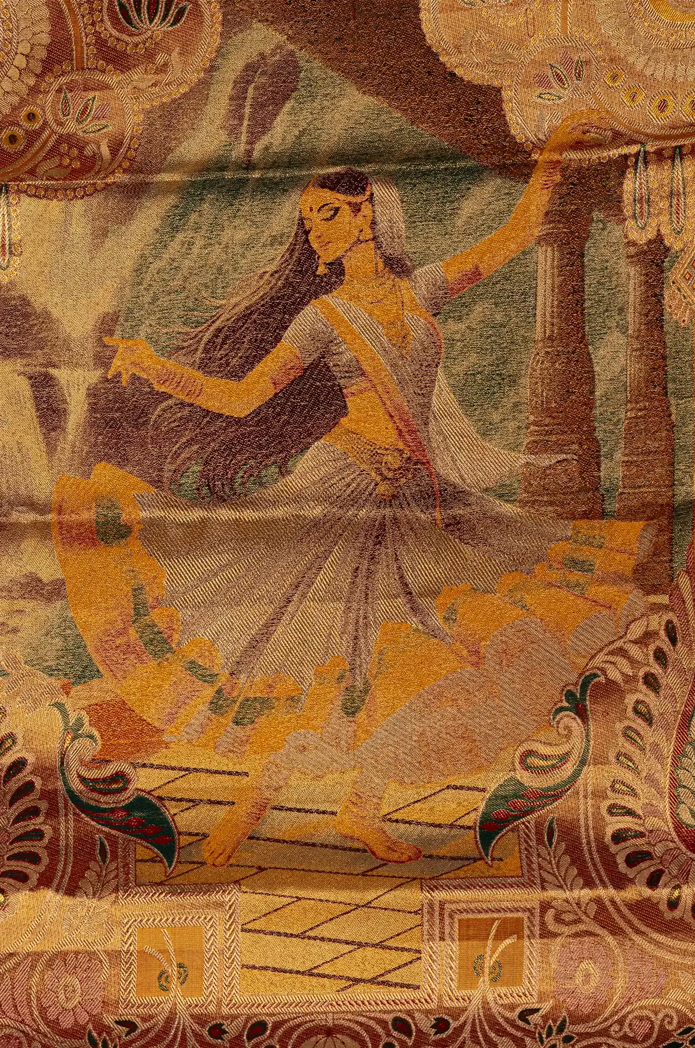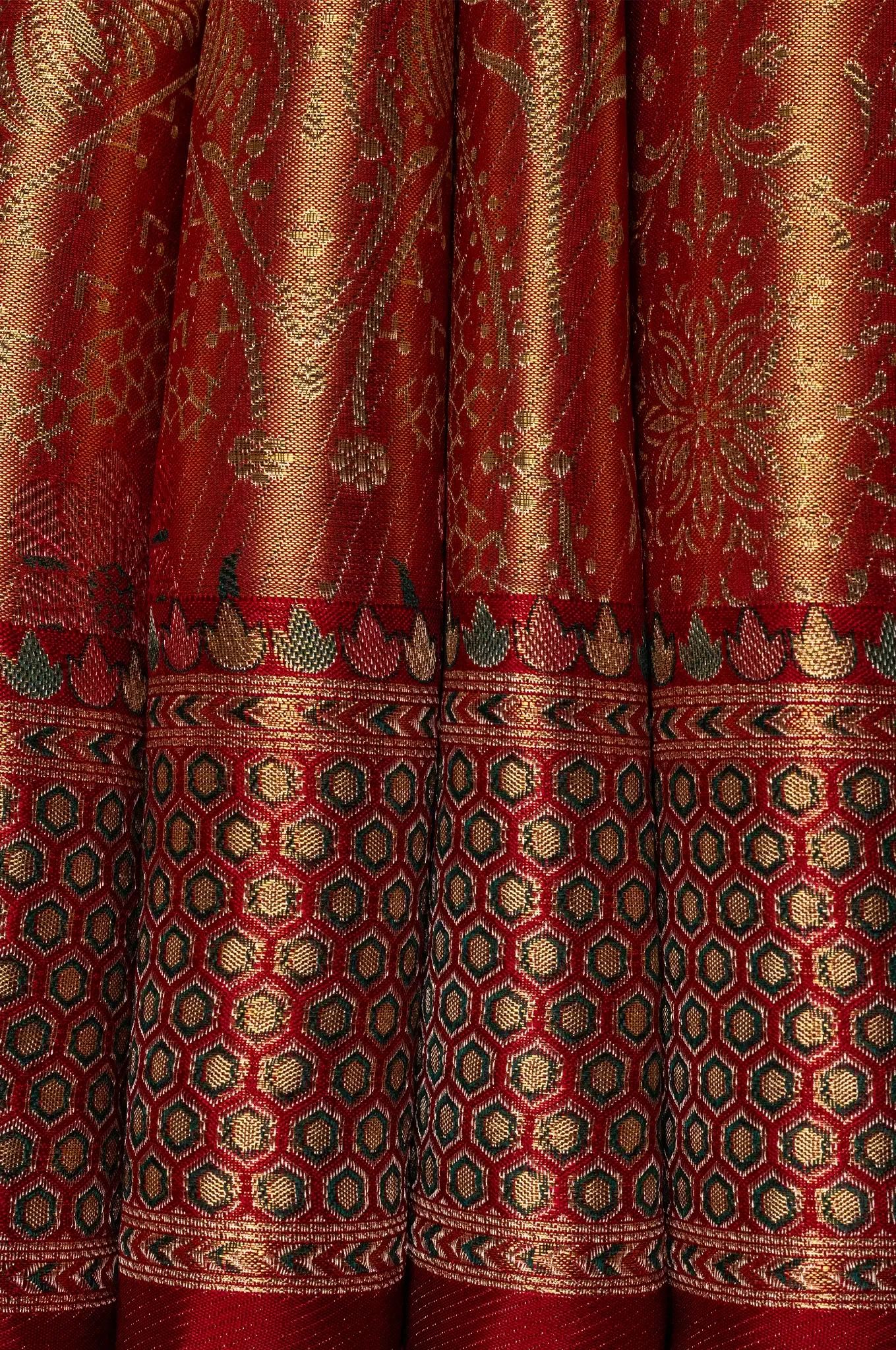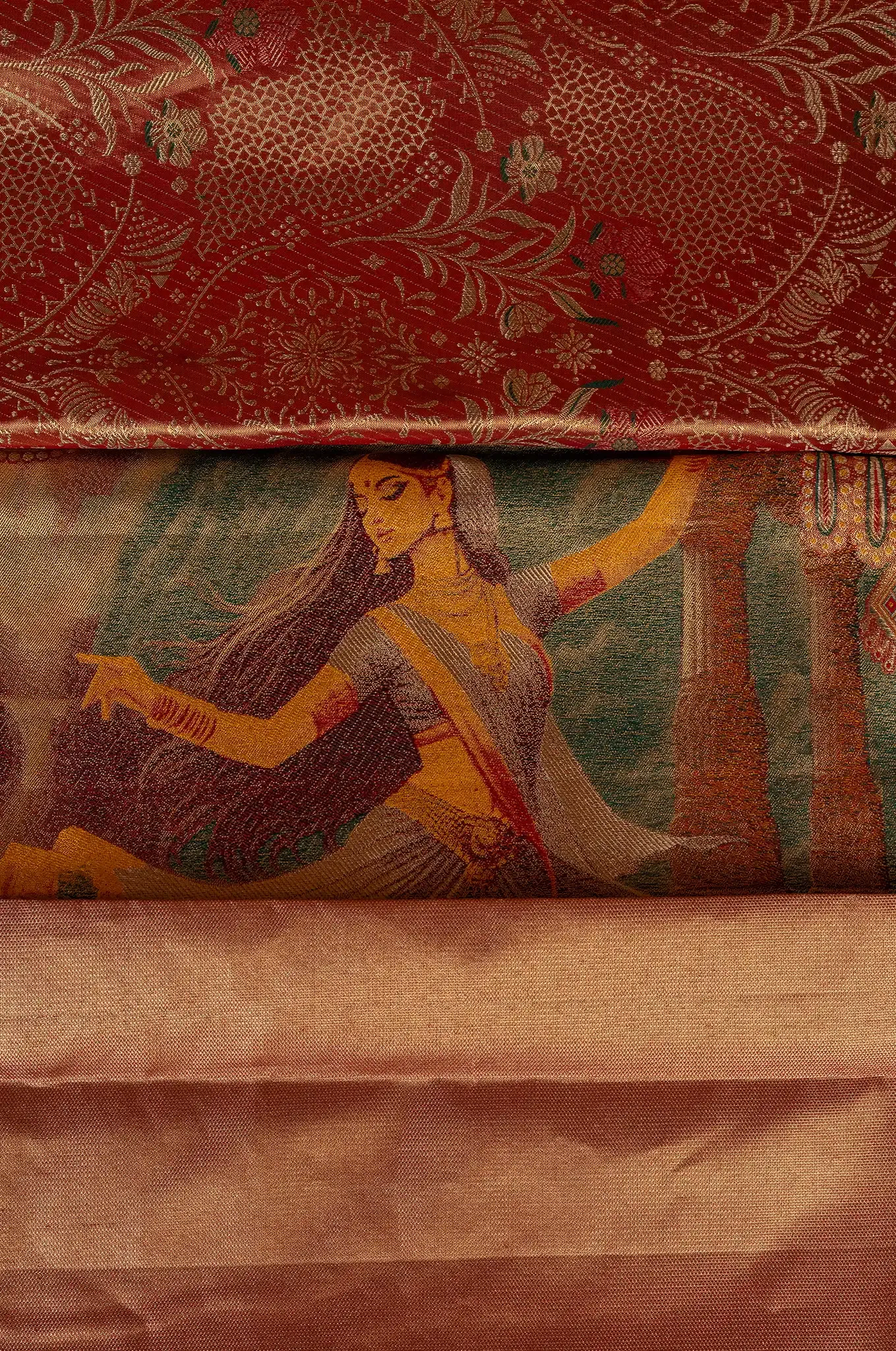 Enhancing the look is a striking maroon border, which creates a rich contrast and frames the design beautifully. The deep maroon shade complements the gold base, adding depth and a classic traditional touch
